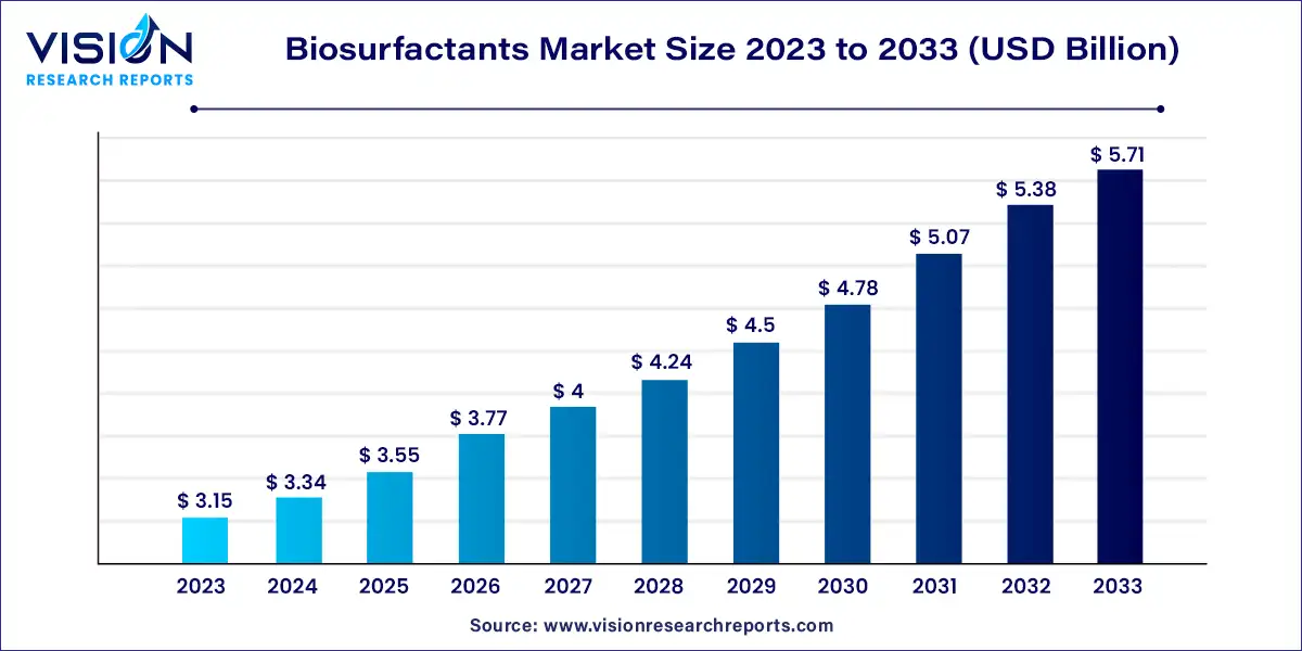 The global biosurfactants market size was estimated at USD 3.15 billion in 2023 and it is expected to surpass around USD 5.71 billion by 2033, poised to grow at a CAGR of 6.13% from 2024 to 2033. Biosurfactants are surface-active substances produced by microorganisms, offering sustainable and eco-friendly alternatives to synthetic surfactants derived from petrochemical sources. These compounds have gained considerable attention due to their biodegradable nature, low toxicity, and the ability to function under extreme conditions of pH, temperature, and salinity.