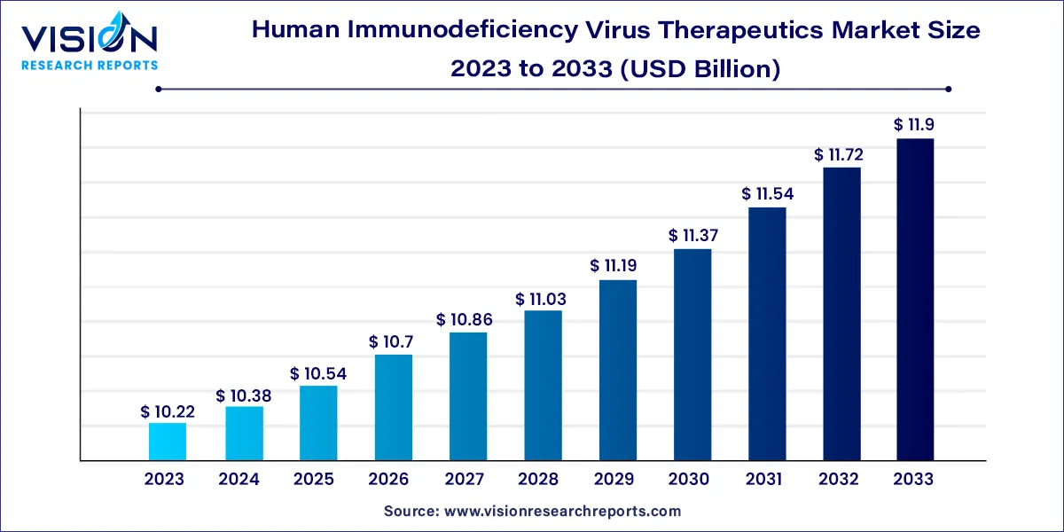 The global human immunodeficiency virus therapeutics market size was estimated at around USD 10.22 billion in 2023 and it is projected to hit around USD 11.9 billion by 2033, growing at a CAGR of 1.53% from 2024 to 2033.