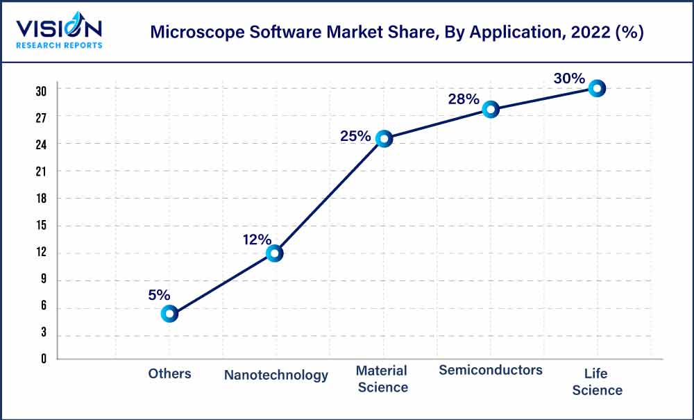 Based on application, the microscope software market has been segmented into life science, material science, nanotechnology, semiconductors, and others. In 2022, the life science segment held the largest market share at 30%. Compound microscopes, such as inverted, upright, and laser microdissection, fluorescence, and digital microscopes, are utilized in life sciences research. Furthermore, the expanding application scope in disease diagnosis is driving the market growth.
