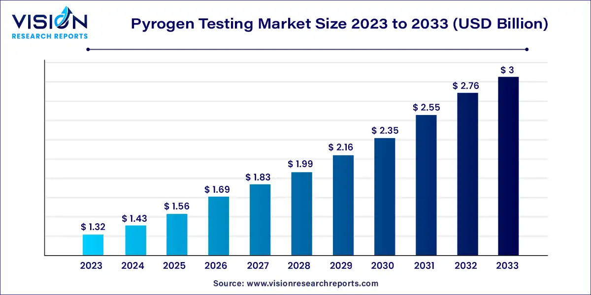The global pyrogen testing market size was estimated at around USD 1.32 billion in 2023 and it is projected to hit around USD 3 billion by 2033, growing at a CAGR of 8.56% from 2024 to 2033.