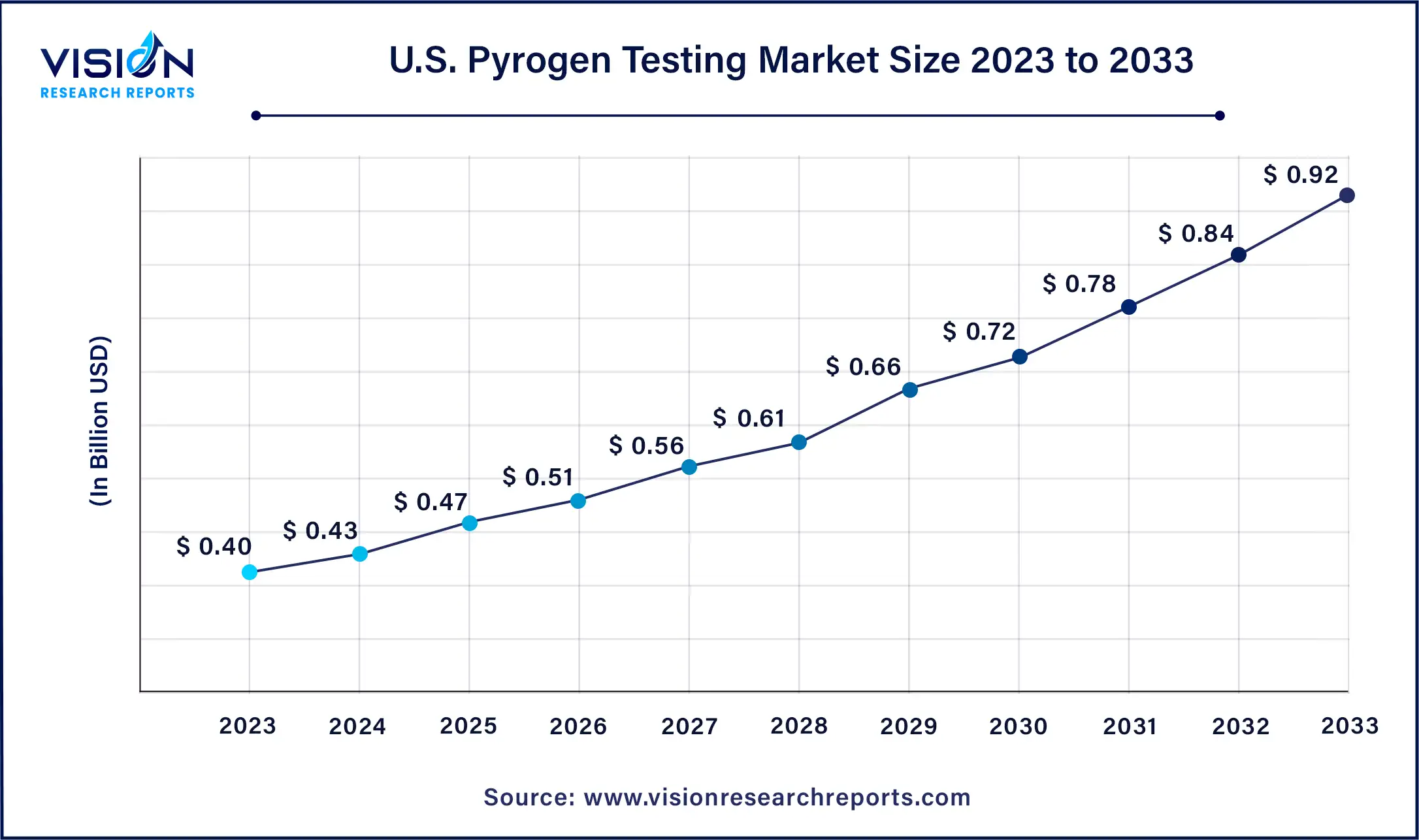 The U.S. pyrogen testing market size was estimated at around USD 0.40 billion in 2023 and it is projected to hit around USD 0.92 billion by 2033, growing at a CAGR of 8.68% from 2024 to 2033.
