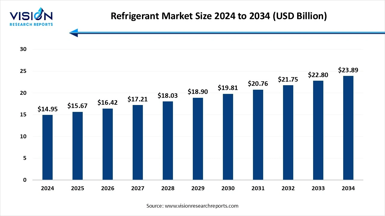 The global refrigerant market size was estimated at USD 14.95 billion in 2024 and it is expected to surpass around USD 23.89 billion by 2034, poised to grow at a CAGR of 4.80% from 2025 to 2034.
