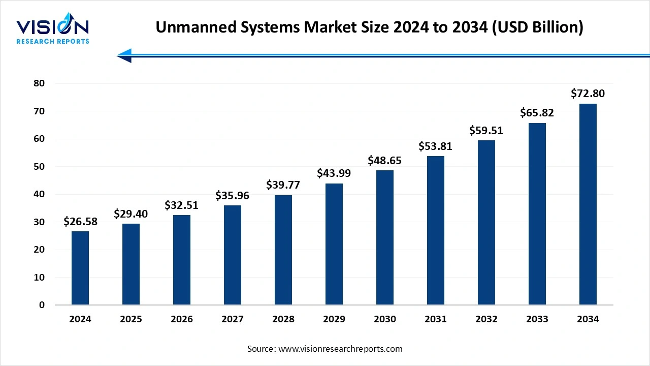 The global unmanned systems market size was estimated at around USD 26.58 billion in 2024 and it is projected to hit around USD 72.80 billion by 2034, growing at a CAGR of 10.60% from 2025 to 2034.